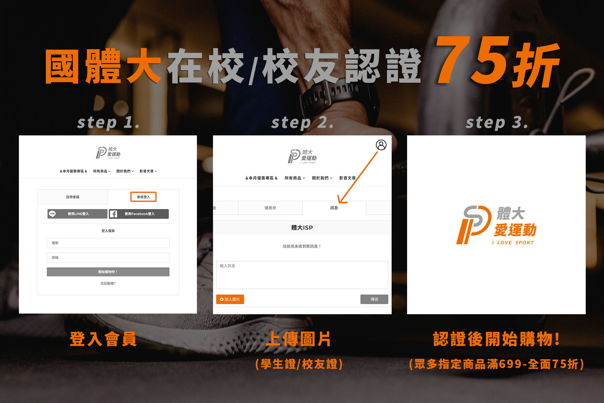 1. 符合條件之會員將享有指定商品75/79折權益:國立體育大學之在校學生、校友、在校教職員。